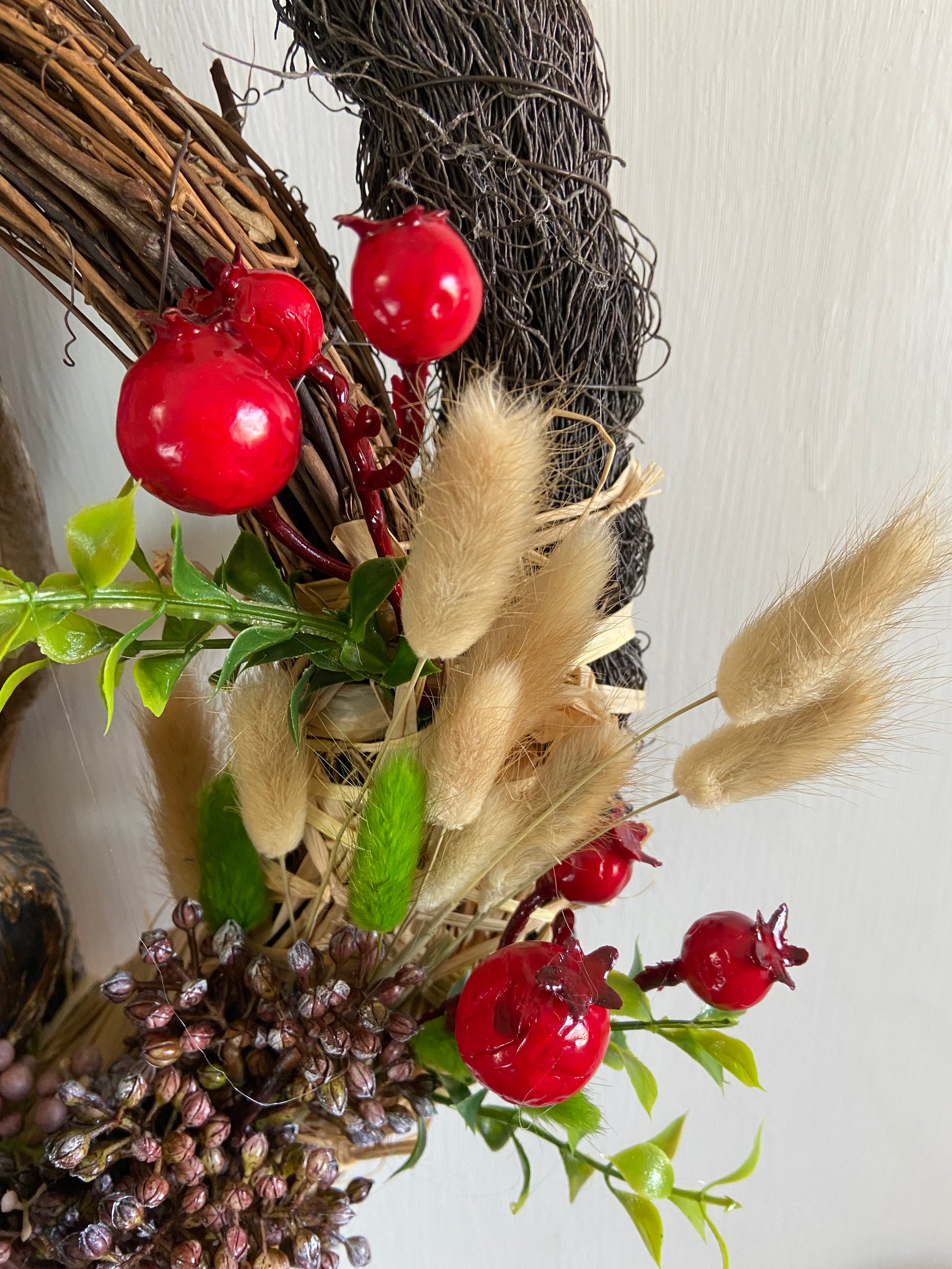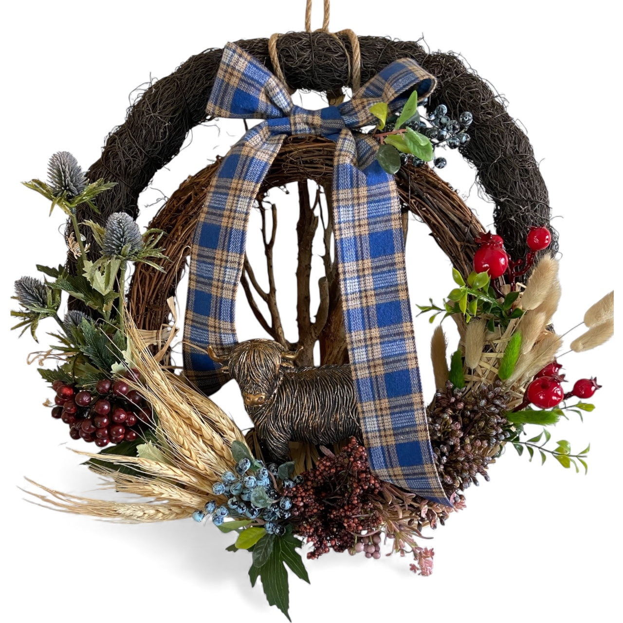 Bring a touch of the Highlands to your home with this striking double wreath, featuring a charming Highland cow at its heart. Lovingly framed by two sturdy wreaths, the centrepiece is surrounded by clusters of deep purple thistles, soft heather, and rich autumn berries, capturing the rugged beauty of the Scottish landscape.