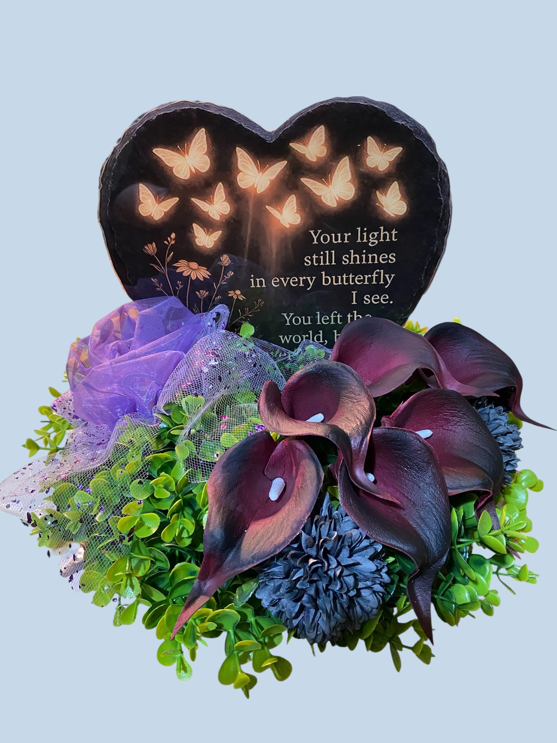 Soft greenery and tasteful floral accents frame the lilies, creating a comforting circle that honours both sorrow and cherished remembrance. Perfect for commemorative displays, funerals, or a private place of reflection at home or graveside, this wreath offers a tender, elegant reminder that love persists — like a light found in every butterfly