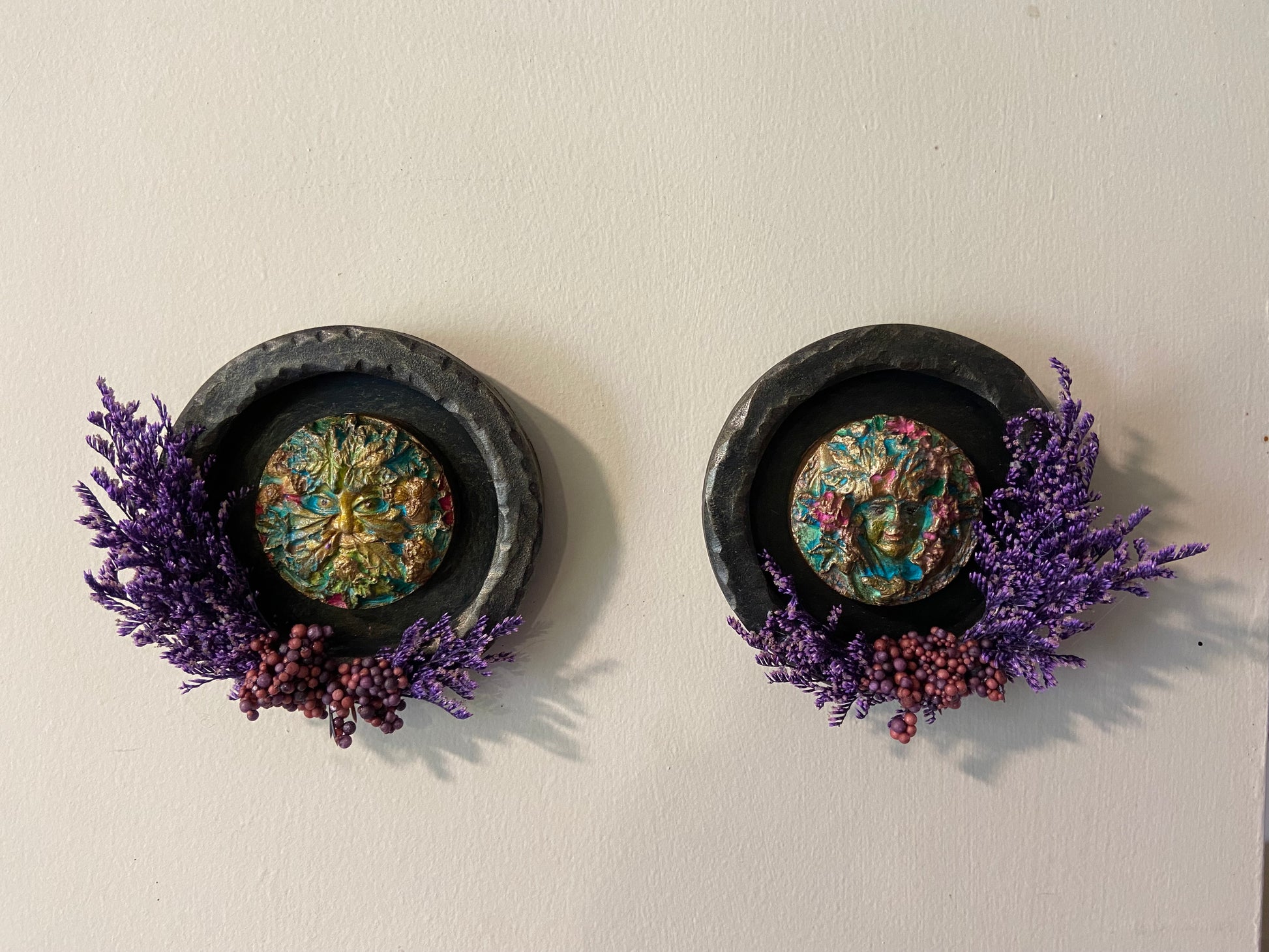 Bring the enchantment of ancient woodland lore into your home or garden with this striking pair of Green Man and Green Woman faces, each beautifully hand painted and mounted on hand-forged wrought iron bases. These mythical figures—symbols of nature’s eternal cycle of growth and renewal—are brought to life in intricate detail, their faces adorned with heathers and berries that echo the spirit of the wild.