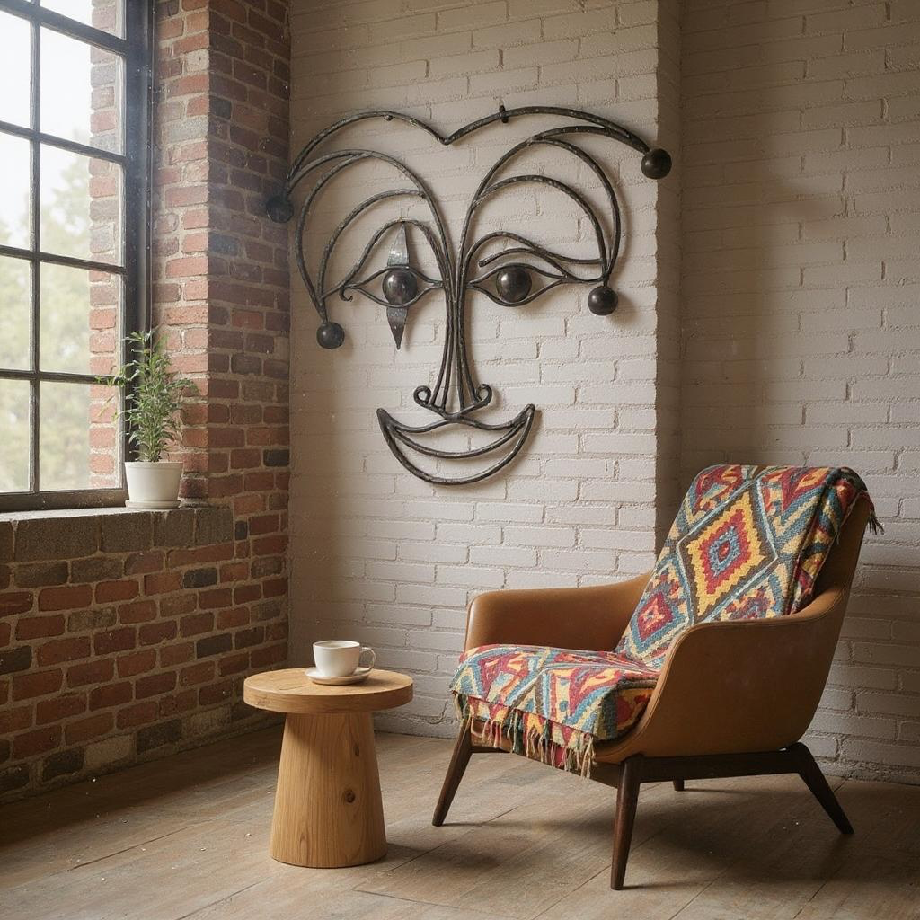 Crafted by skilled artisans, the wrought iron gives it both strength and elegance, with a dark, timeless finish that suits both modern and rustic settings. An indoor piece, the jester’s expressive face brings character, conversation, and a sense of the unexpected.