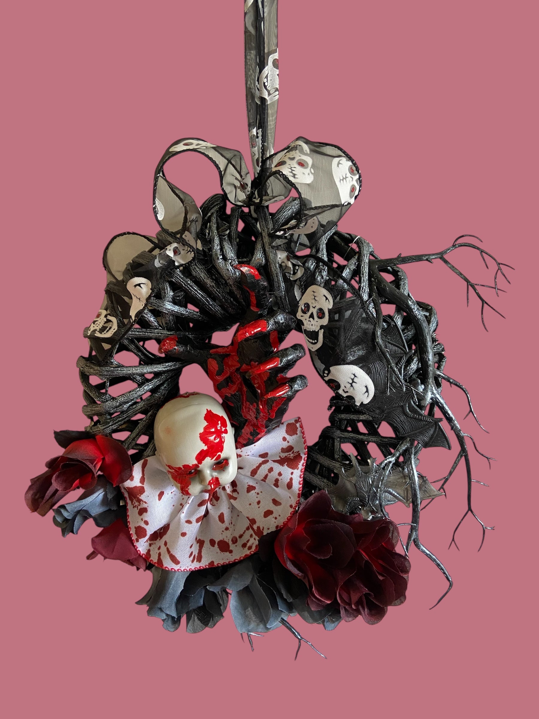 Tangled in eerie black vines, rotting roses and blood spattered ribbon, this wreath is the ultimate statement piece for horror lovers and fearless decorators. Whether it’s for your front door, haunted hallway, or creepy party centrepiece, it guarantees gasps, double-takes—and maybe even a few screams.